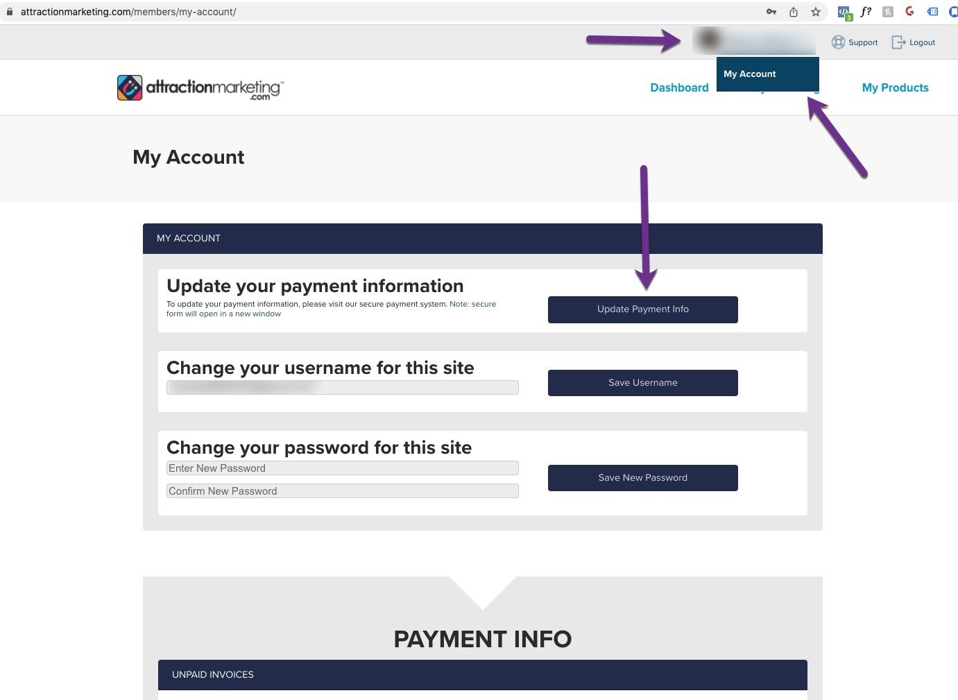 AttractionMarketing.com Member's Area and clicking on the "Update Payment Info" button.