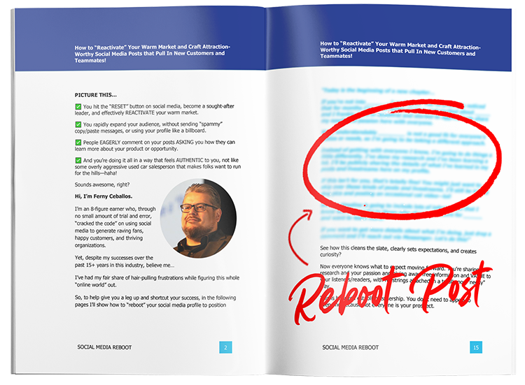 Don't worry though... if what you're currently doing isn't creating the results you desire, in the pages of my Social Reboot report you'll discover EXACTLY how you can hit the RESET button on your profile and start attracting highly interested prospects who EAGERLY comment on your posts ASKING you how they can learn more about your product or opportunity.