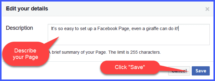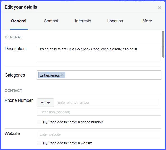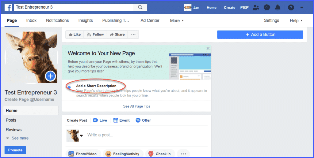 The first thing to do is to add a short description of you and your business that will show up in the “About” section of your page.