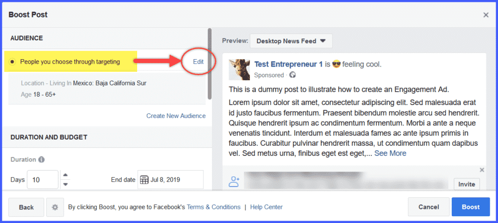 The very first thing you’ll want to do is make sure the radio button shows “People you choose through targeting,” then select “Edit” to laser-target the people you want to engage with your post.