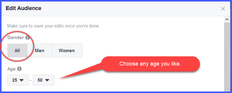 You can specify an Age range to target. For purposes of Network Marketing, it might be best to target an older audience, starting at, say 25. You can be as narrow and specific as you’d like.