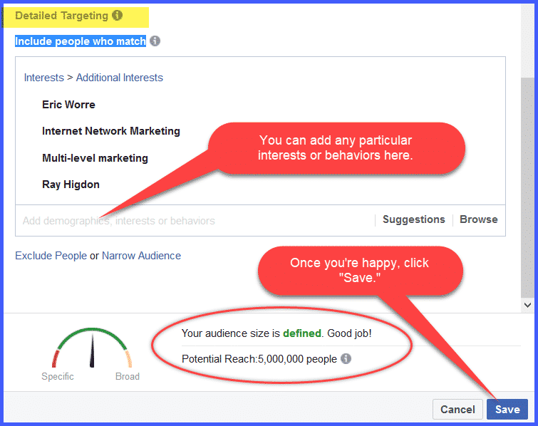 In our Test example, our potential reach is 5,000,000 people, and sits right between “Specific” and “Broad.”