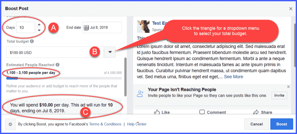 - Choose how many days you want your ad to run. We’ve entered “10 Days.” That should give us a good indication of the engagement our post will generate over time.