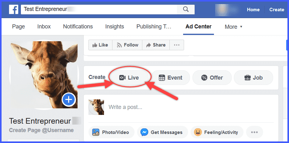 From your Facebook Page, at the top of your News Feed where it says “Create,” Click “Live.”