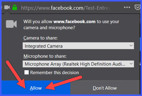 When this window pops up, click “Allow” to give Facebook permission to use your camera.