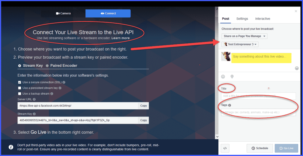 Over on the right, you’ll see a place to enter a title and description for your Live event. Write a few words about your live video in the space indicated. Use the same compelling headline you created for your promotion, so people have a reason to join and stay with you.