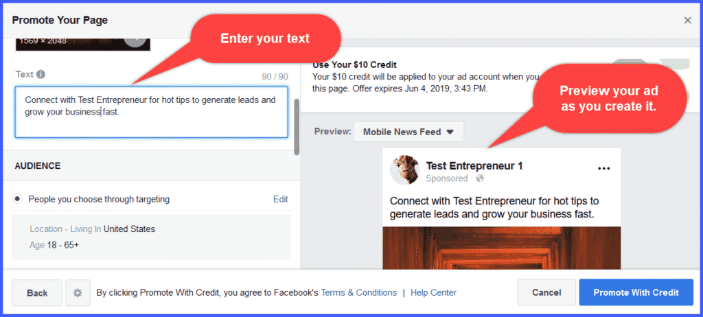 Notice that over on the right side, you see your ad as you create it, and it contains the original page description you entered when you set up the page.