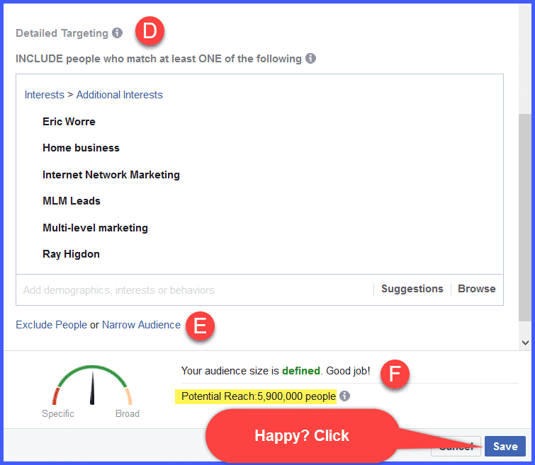 You can filter your audience by demographics, interests, and behaviors. You’ll definitely want to explore this area to find people interested in not only network marketing, but also specific companies and products.
