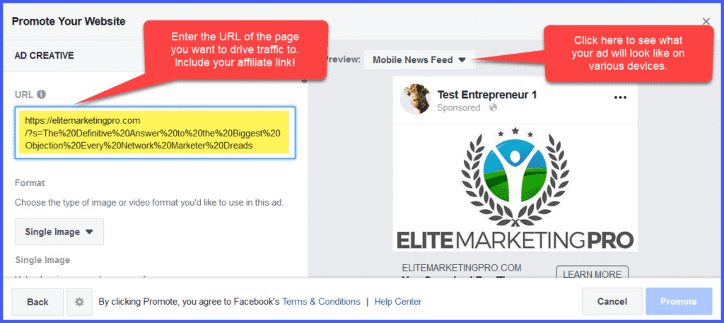 The first thing we’ll need to determine is WHERE we want to send the traffic. In this example, we’re going to drive traffic to a popular EMP blog post that links to an Attraction Marketing Capture Page: “The Definitive Answer to the Biggest Objection Every Network Marketer Dreads.” Whatever you choose, make sure to include your affiliate ID on it!