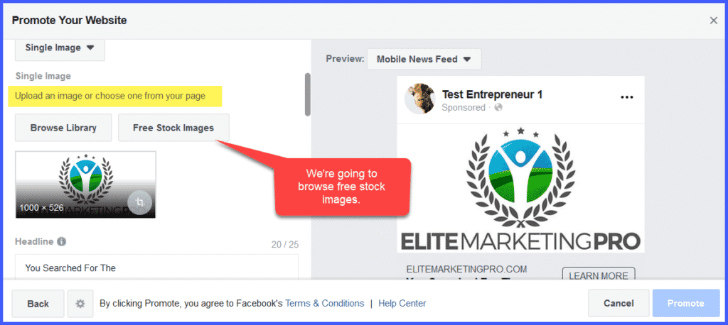 As you scroll down, you’ll come to a place where you can choose a source for your image – your own Library, a file on your computer, or Free Stock Image.