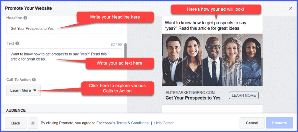 Enter a Headline (remember you have only 25 characters, so make it count! We’ve boiled down our Headline to Get Your prospects to Yes (25 Characters exactly.)